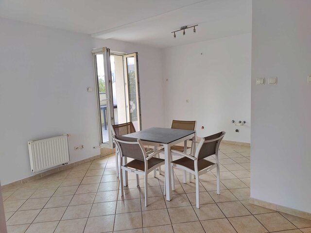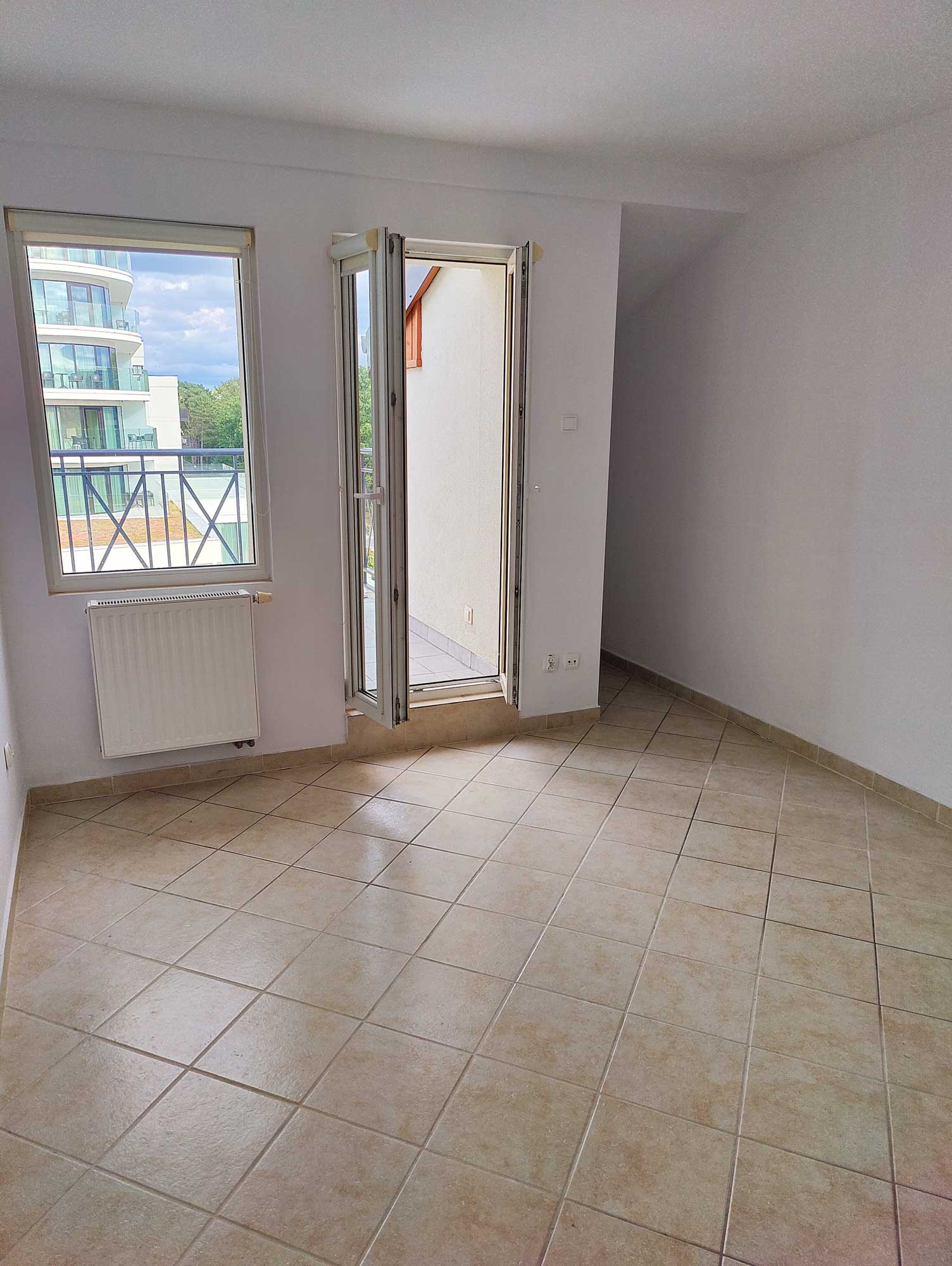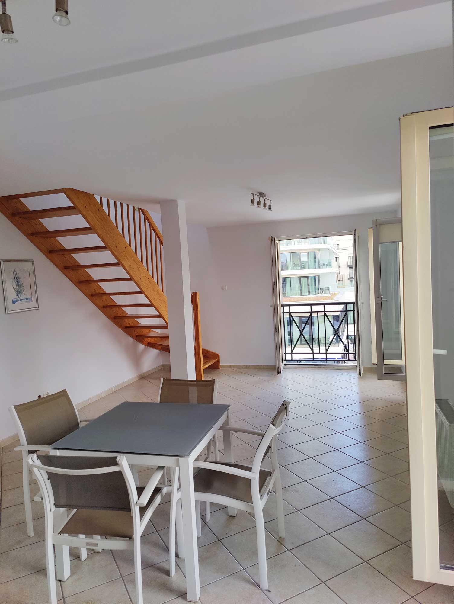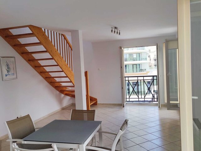 Auf der unteren Ebene gibt es ein großes Wohnzimmer mit Küchenbereich und Terrasse, Schlafzimmer mit Balkon und Bad mit Dusche. Auf der oberen Ebene gibt es zwei Schlafzimmer mit Balkonen und ein großes Bad mit Badewanne. Die Badewanne ist eine Eckbadewanne. Die Immobilie bietet 83,05 m². Das Haus wurde kürzlich isoliert und gestrichen. Das Appartement in 1a Lage wird gemalert und unmöbliert übergeben.